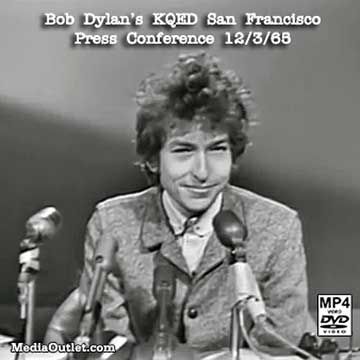 When Bob Dylan‘s five concerts in the San Francisco Bay Area were scheduled for December 1965, it was proposed he hold a press conference on Friday, December 3rd in the studios San Francisco's educational television station KQED-TV Channel 9 (now a PBS member station). Dylan accepted the proposal, and flew out a day early to make it. He arrived early, accompanied by Robbie Robertson and several other members of his band (which ultimately became known as "The Band"), drank tea in the KQED office, and insisted e was ready to talk about “anything you want to talk about.” His only request was that he be able to leave at 3 p.m. so that he could rehearse in the Berkeley Community Theater where he was to sing that night. On this same day, two seminal albums were released: The Who's "My Generation" in the UK, and The Beatles' "Rubber Soul" worldwide. At the press conference there were TV news crews of all the local stations, reporters for three metropolitan dailies (their stories were subsequently compared to the broadcast of the interview by a University of California journalism department class), representatives of several high school papers, and personal friends of Dylan including poet Allen Ginsberg, impresario Bill Graham and comedian Larry Hankin, all of whom are seen and heard during the press conference. The questions ranged from standard journalistic questions to teen fan club inquiries to "in-group" personal interrogatories and put ons, to questions by those who really had listened to Dylan’s songs. He sat on a raised platform facing the cameras and the reporters, and answered questions before a bank of four microphones, all while chain smoking cigarettes and swinging his leg back and forth. At one point he held up a poster for a Friday, December 10th benefit for The San Francisco Mime Troupe (the first rock dance at Bill Graham's Fillmore Auditorium, one of the first public dances to feature the Jefferson Airplane, and featuring The Great Society (whose singer Grace Slick soon joined The Jefferson Airplane). At the conclusion of the press conference, he chatted with friends for a bit, jumped into a car and went back to Berkeley for the rehearsal. He cut the rehearsal short so as to get to his hotel and watch KQED's broadcast of the press conference that night. It was rebroadcast the following week.
